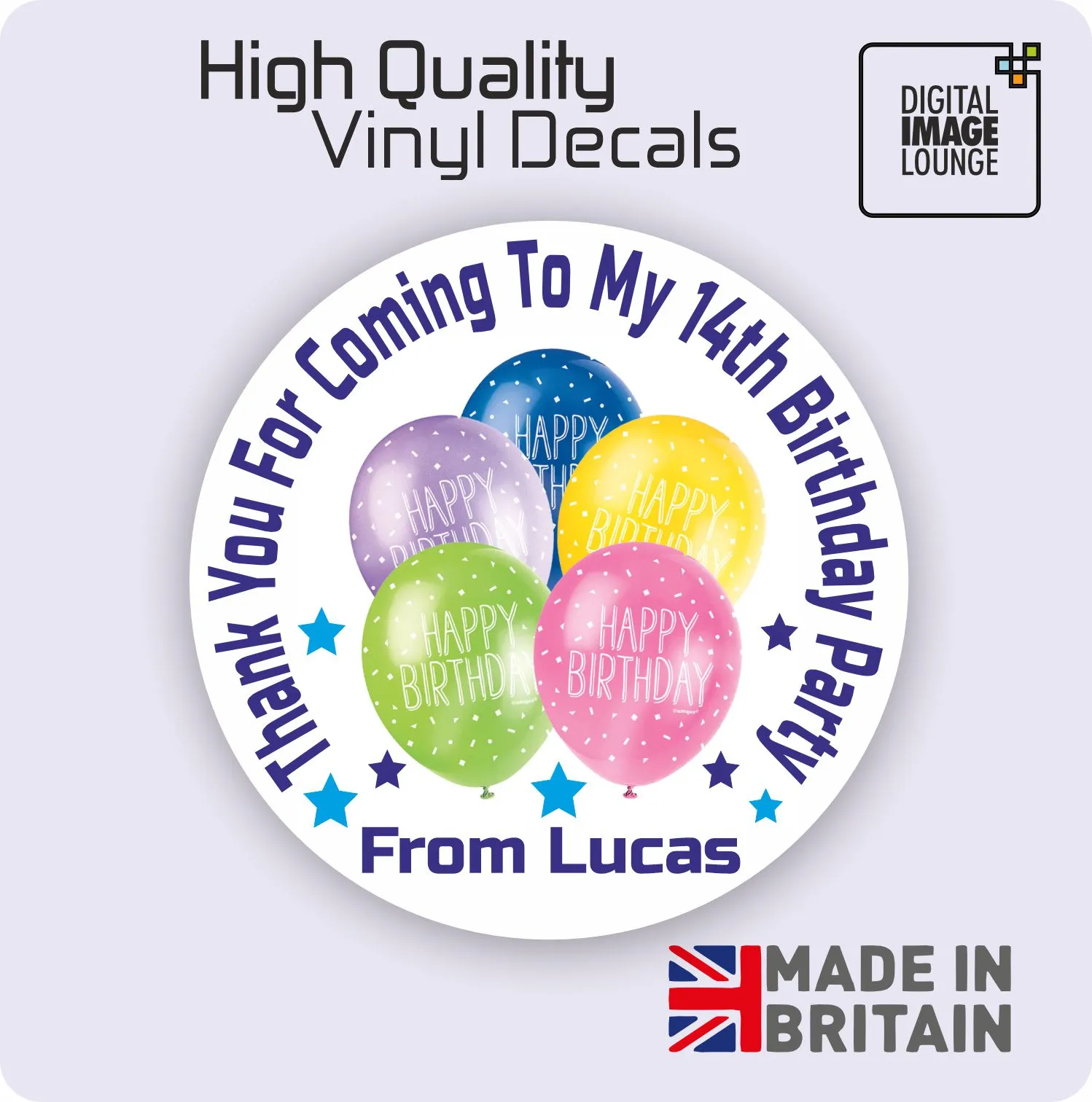 Personalised printed round stickers that will make a great addition to party bags & sweet cones.