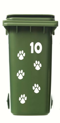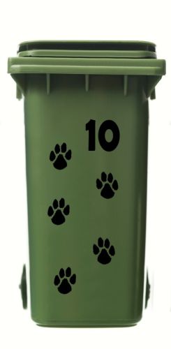 1 x Set of five 100mm (approx) high Wheelie Bin Vinyl stickers paw print style with house number – Make your bin stand out from the rest.