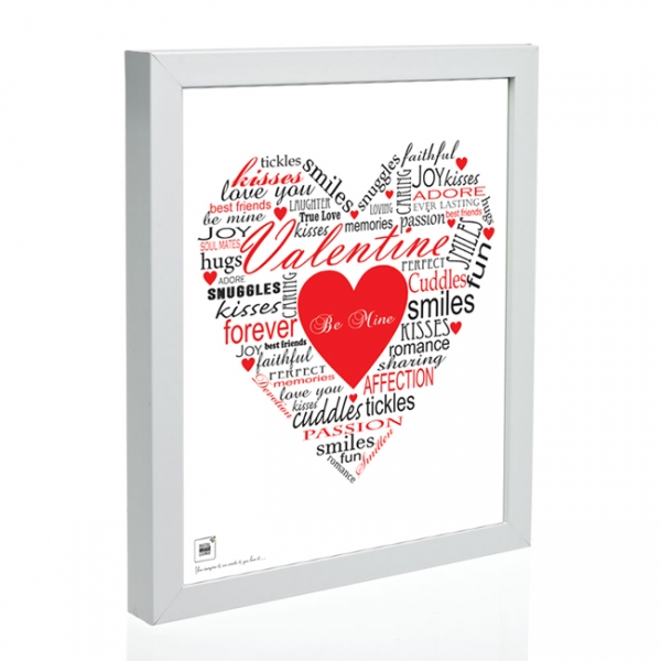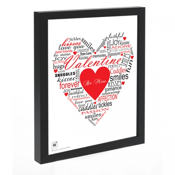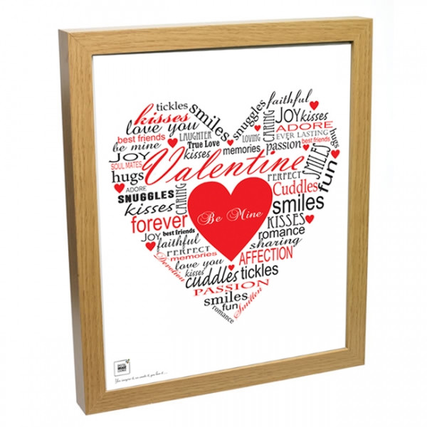 We will create your print by using 8 of your own words incorporated within the other text to build the heart shape. The words you use will be in a colour of your choice, with the standard text printed in black (see images).
